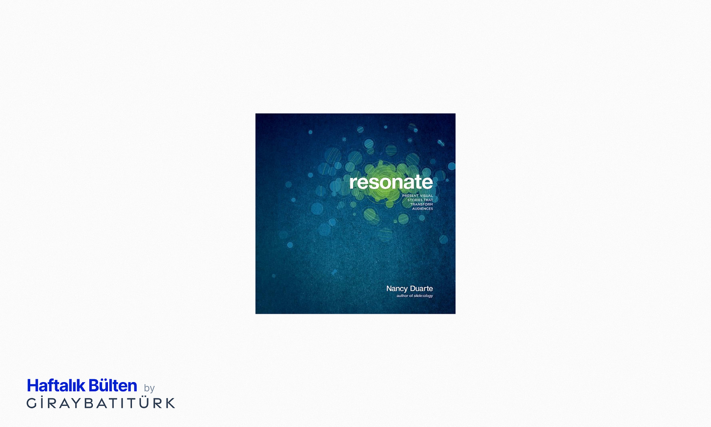 Tek İngilizce önereceğim kitap; Nancy Duarte' nin "Resonate" kitabı, etkili iletişim kurmayı hedefleyen herkes için güçlü bir araçtır. Bu kitap, etkili içerik ve sunumlar oluşturma üzerine derinlemesine bir bakış sunar, bu da genellikle çalışmalarını ikna edici bir şekilde sunmak ve portfolyosunu iyi aktarmak isteyenler için önemli bir kaynaktır. Kitaptaki içgörüler, tasarımcıların tasarım çözümleri etrafında etkileyici anlatılar oluşturmasına yardımcı olur, böylece onların müşteriler ve paydaşlarla daha iyi iletişim kurmalarını sağlar.